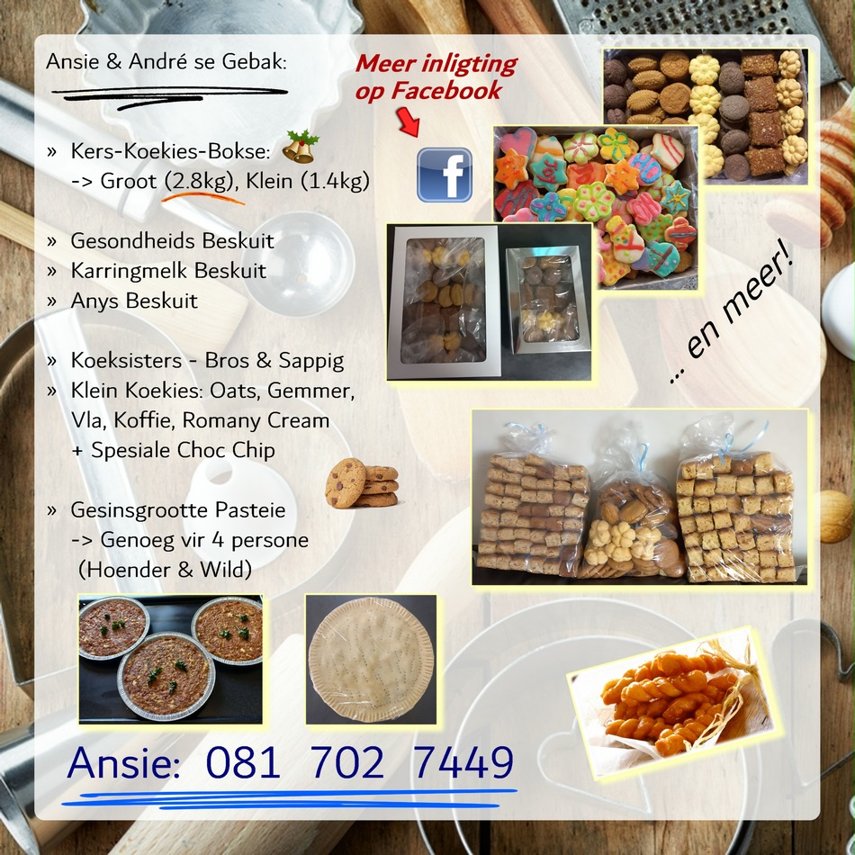 CLICK HERE for more information about the above deliciousness on Facebook: https://www.facebook.com/ansieenandre.swart